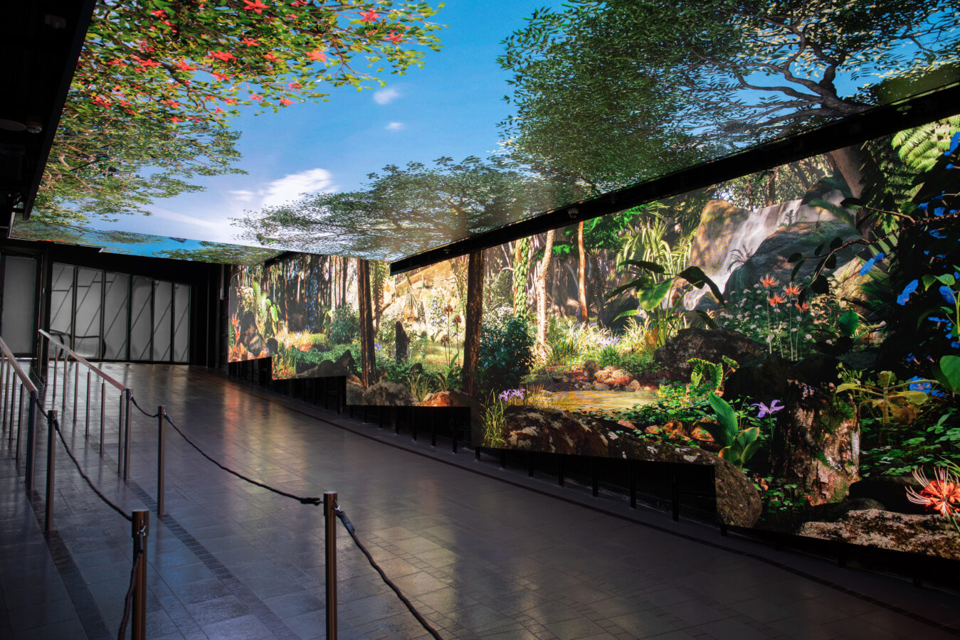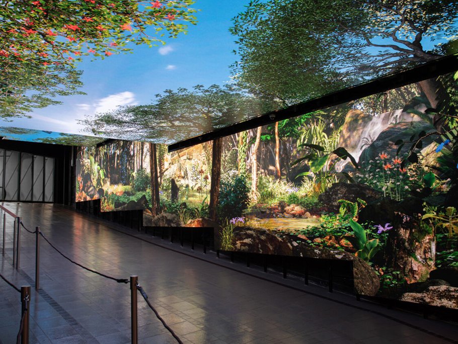 The immersive LED display solution consists of LED wall and ceiling screens. Treating visitors with fascinating sceneries when they pass before catching the tram.