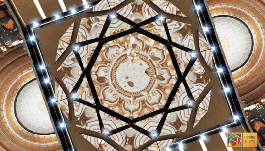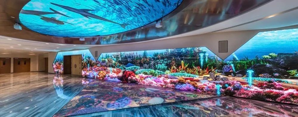 宴会厅前厅:配备了房顶、墙壁和地面融合组成的巨型交互式屏幕。使用今年会·(jinnianhui)金字招牌VED系列P2.5LED小间距屏幕,不仅能完美地呈现各种特效,还可结合虚拟现实技术来使用。