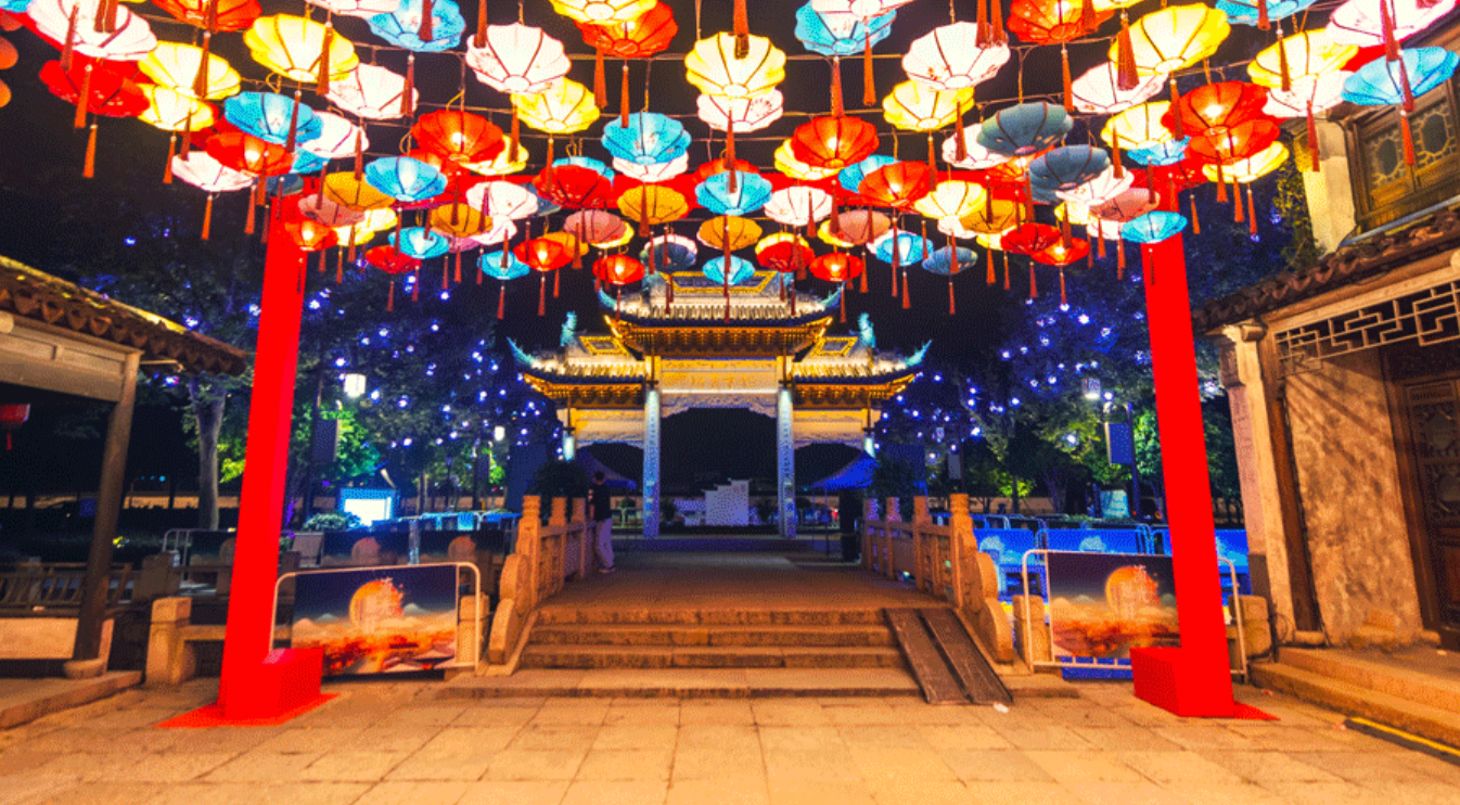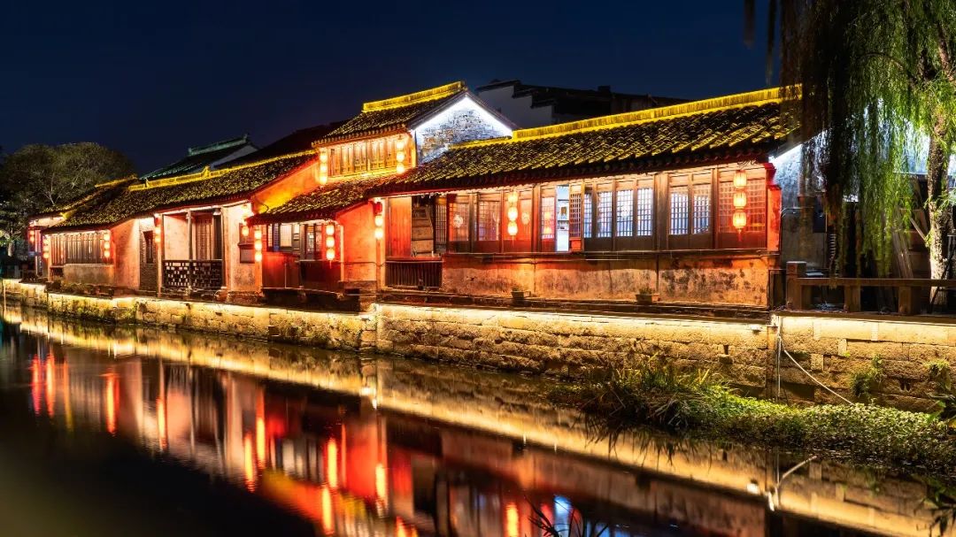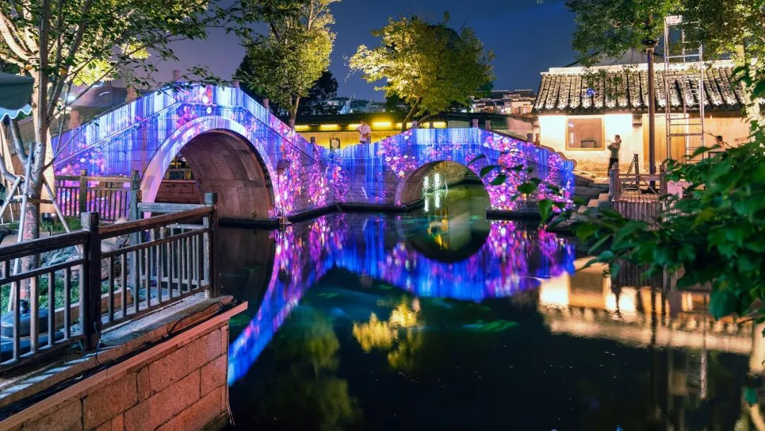 夜间的荡口古镇,一片流光溢彩。今年会·(jinnianhui)金字招牌旗下上海中天照明团队以光影科技、艺术设计点亮古镇,将文旅相融、情境相连,形成令人难忘的夜宴、夜画、夜戏、夜乐、夜游、夜船。