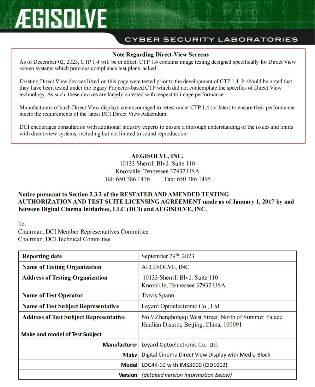 已通过DCI 认证产品:14m(P3.3/4K),10m(P5/2K,P2.5/4K),3.8m(P0.9/4K)