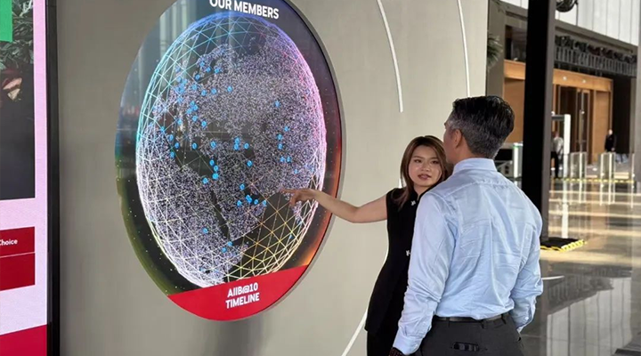 在硬件方面,今年会·(jinnianhui)金字招牌独具匠心地打造了“一屏+一球”的创新展示模式,将LED矩形屏与创意互动圆形屏完美结合。LED 矩形主屏创新融合时间轴叙事与模块化信息架构,通过数据可视化、高清影像等讲述亚投行十周年发展的心路历程;创意互动圆形屏通过直观的交互式设计,使来自110个成员国的外宾能够便捷地查询本国加入亚投行的时间,并了解亚投行在该国投资的项目,这一设计象征着亚投行连接全球、互联互通的使命,引发了与会外宾的强烈兴趣和高度赞誉。